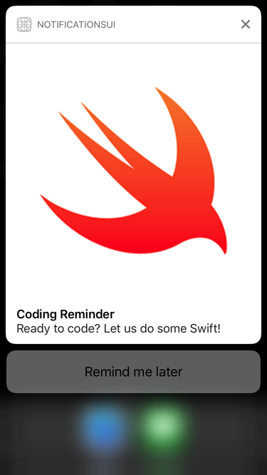 下面一段代码就是创立了一个 “Remind me later” 的 UNNotificationAction 响应操作,并将其加入到 “normal” 的 UNNotificationCategory 类别之中。