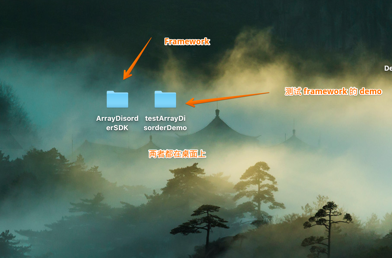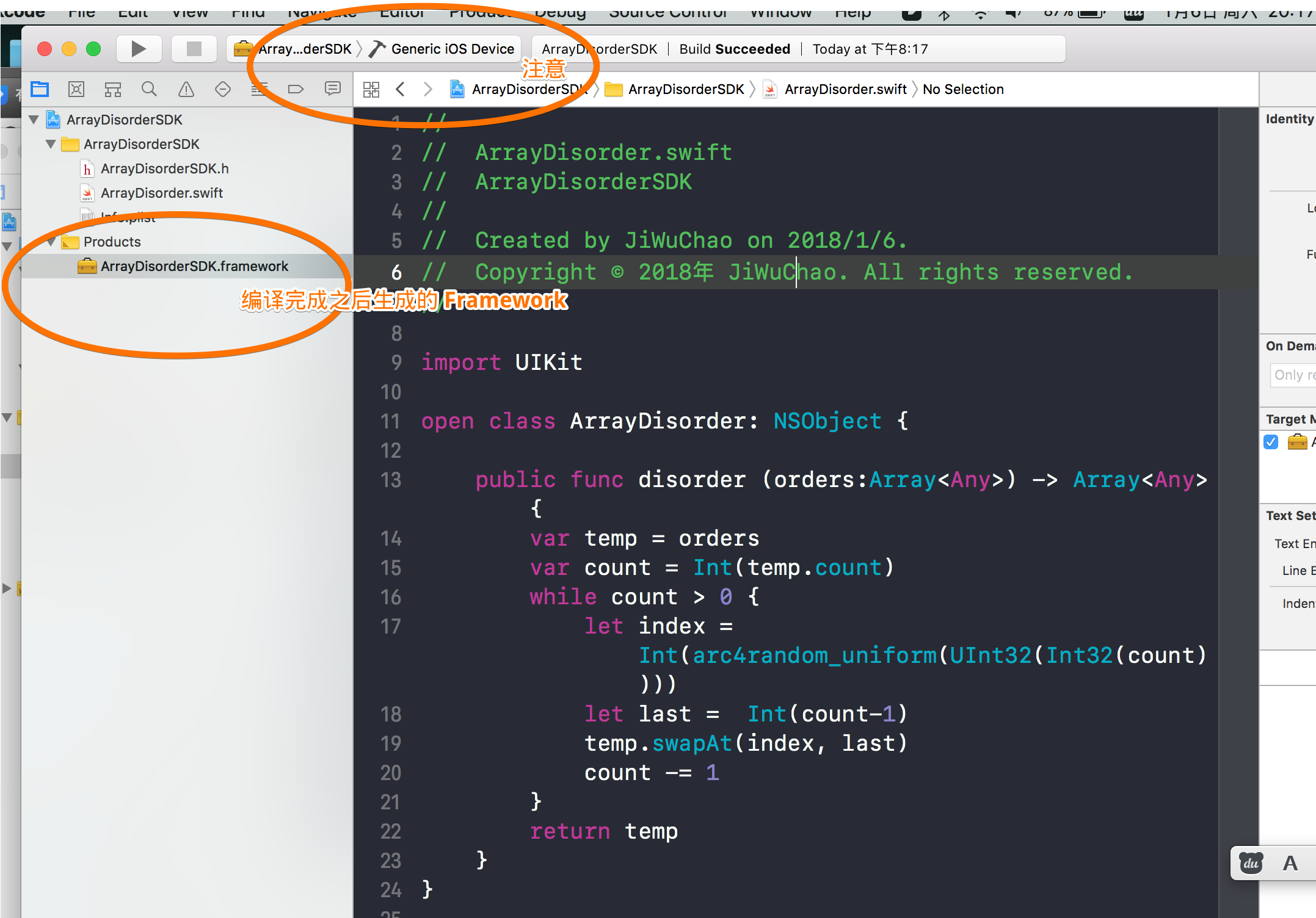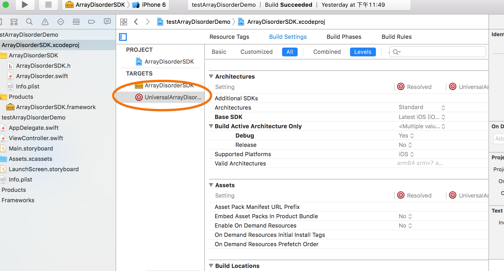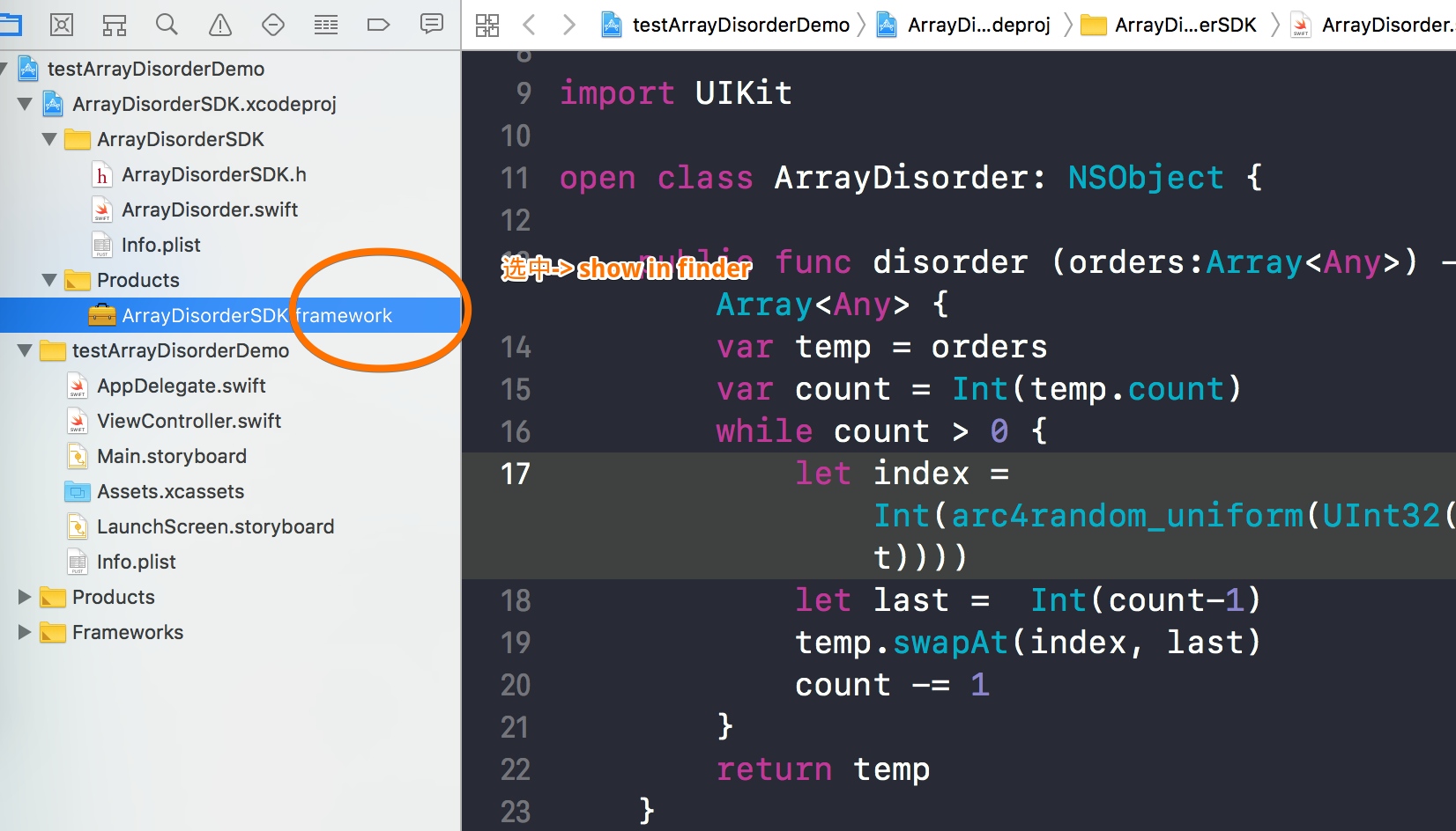 - 注意: 当你修改 framework 中的代码时要想测试下修改的效果,你必需先编译下你的 framework 的 target 如本文中所示的就要先编译下ArrayDisorderSDK的 target,不编译的话就相当于你的 测试你 framework 的 Demo 用的还是原来的 framework 而不是修改后的