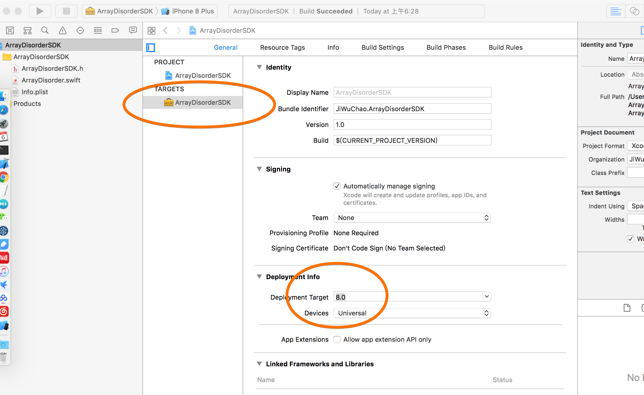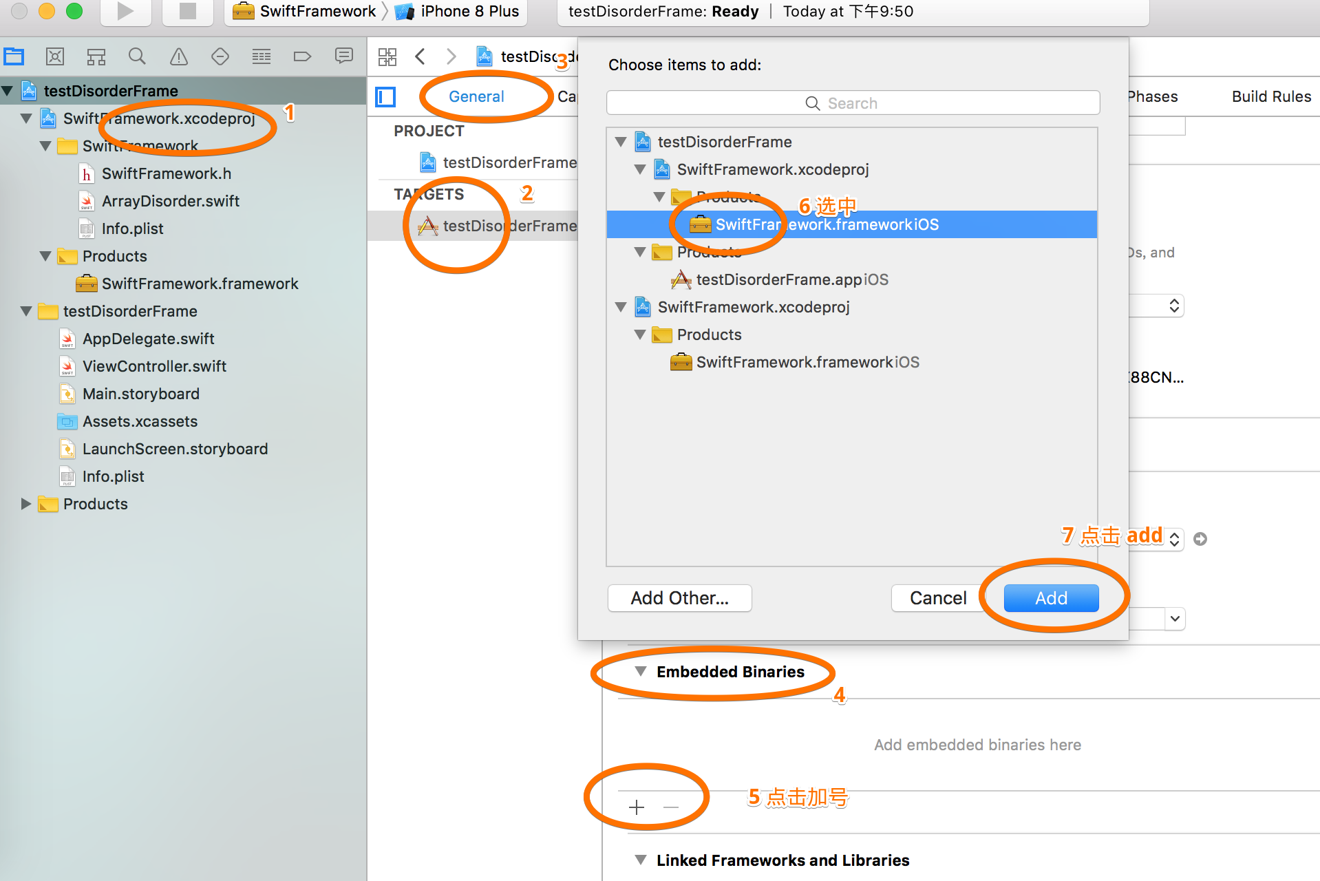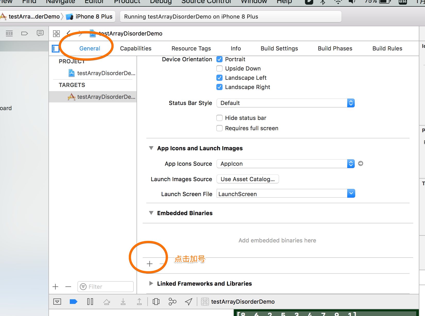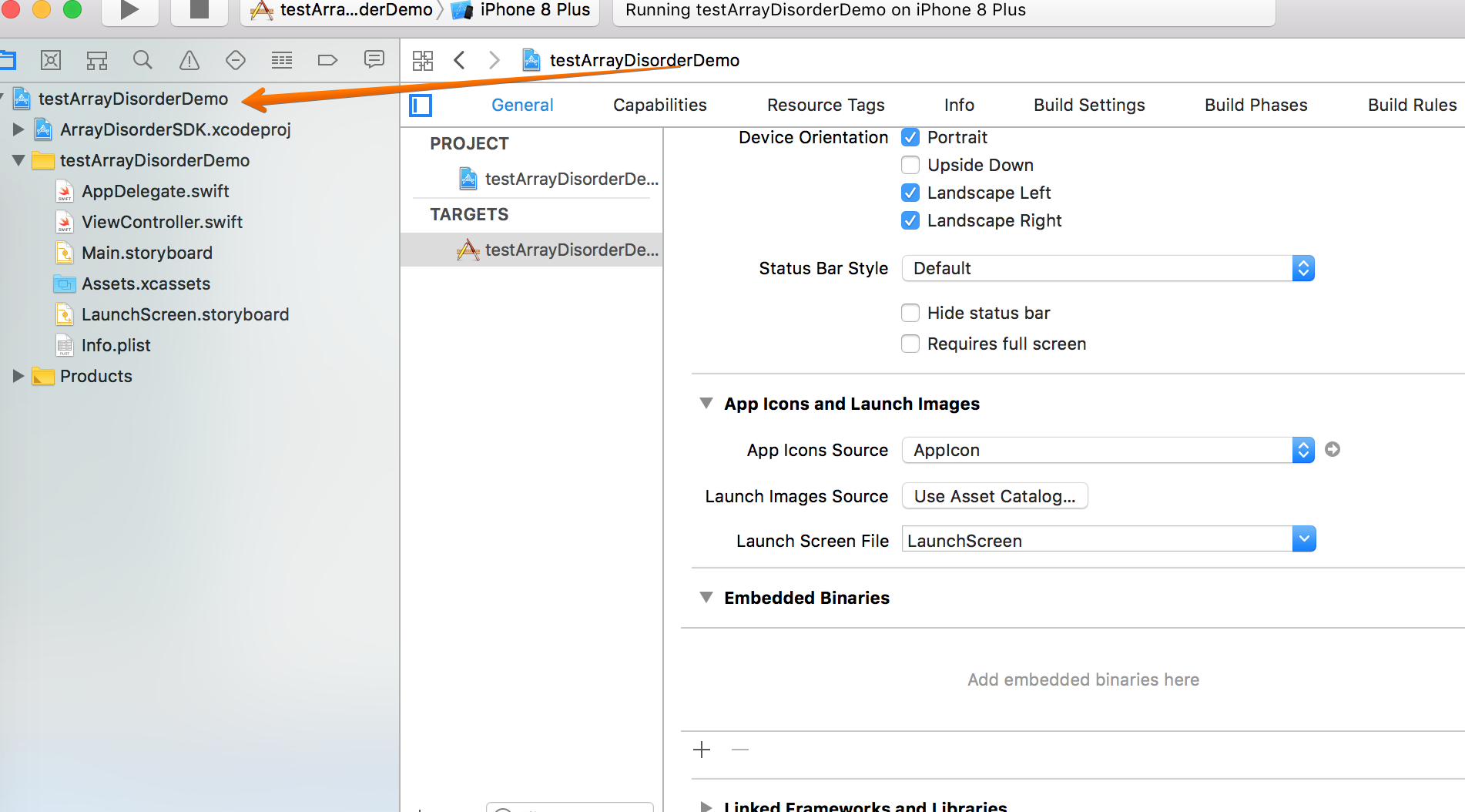 – > General ->Embedded Binaries-> 点击加号-> add Other -> 选中ArrayDisorderSDK.xcodeproj