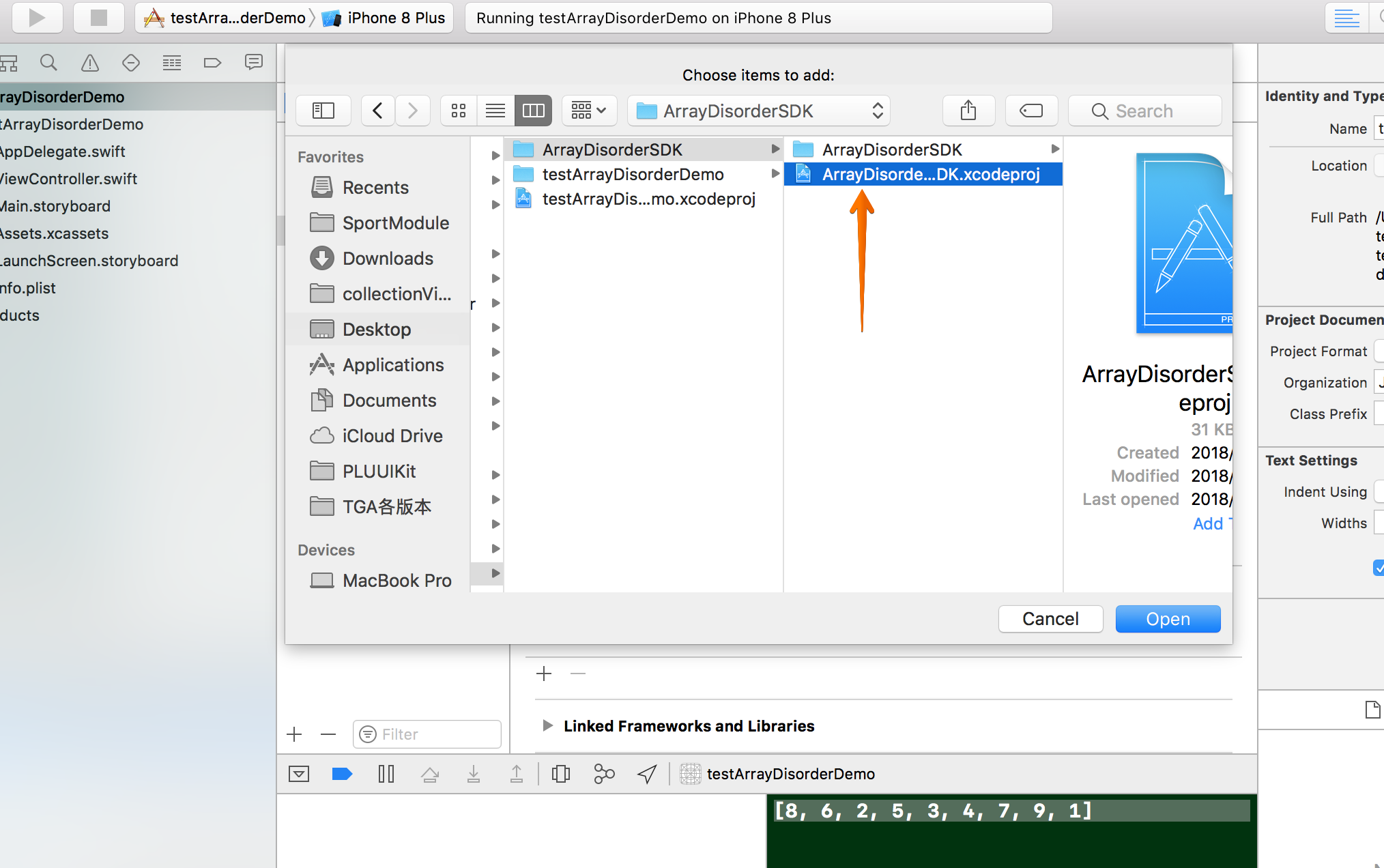 这时你会发现可以直接在testArrayDisorderDemo 的 ViewController 中直接 导入ArrayDisorderSDK就可以了 不需要在删除然后再拖入了. 最重要的是 ,当你选中的testArrayDisorderDemo Tagret 运行的时候 当程序走到 framework 中去的时候 你还可以打断点等方式调试. 效率会很高.