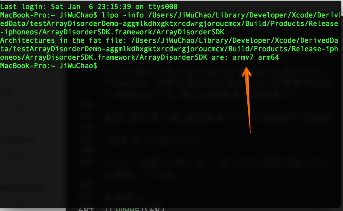 把ArrayDisorderSDK 文件拖入控制台 然后回车 控制台就可以输出ArrayDisorderSDK 的 CPU 架构 如 armv7 arm64