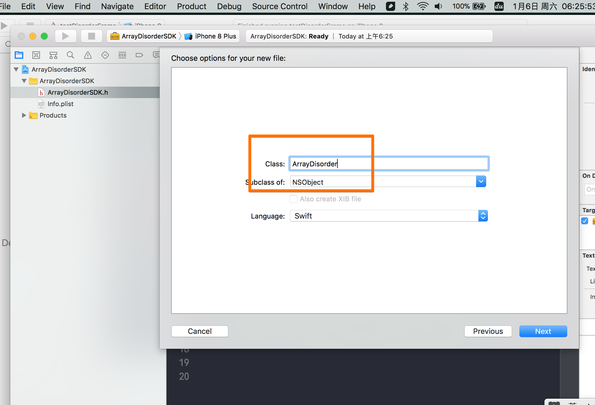 2.点击 Next -> Protect Name 为 ArrayDisorderSDK launguage 选为 Swift 点击 Next 新建完成
